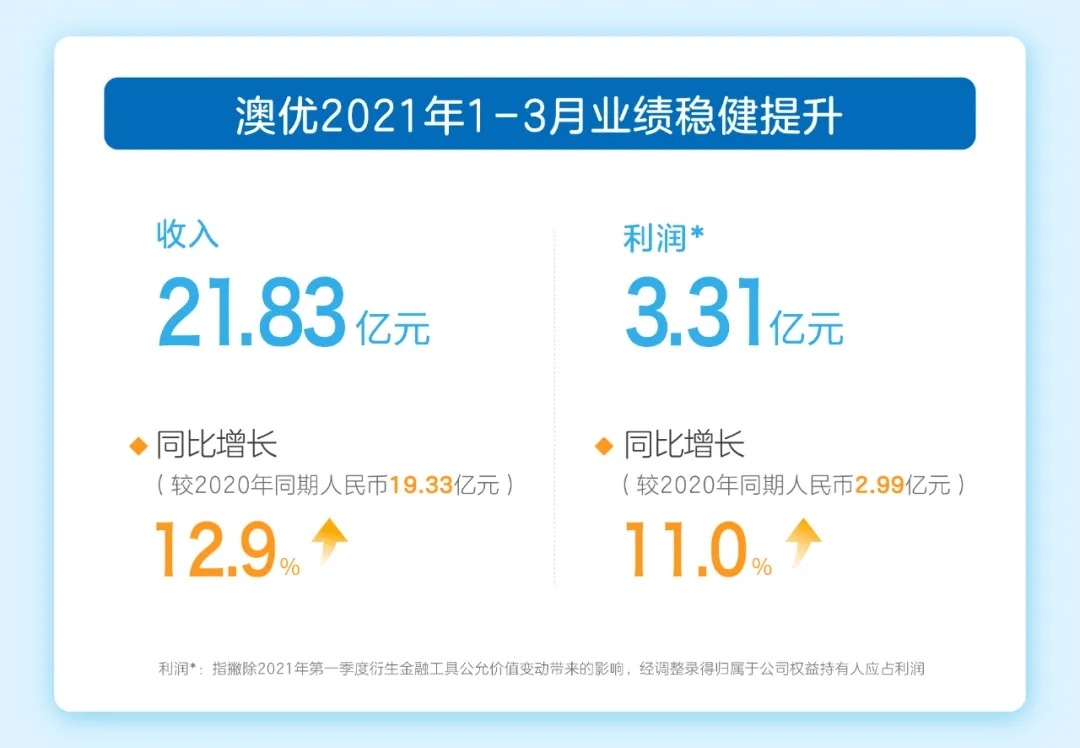 公告顯示,2021年第一季度澳優錄得收入為人民幣21.83億元,較2020年同期人民幣19.33億元同比增長12.9%;毛利為人民幣11.16億元,較2020年同期同比增長7.2%;撇除2021年第一季度衍生金融工具公允價值變動帶來的影響,經調整錄得歸屬于公司權益持有人應占利潤為人民幣3.31億元,較2020年同期人民幣2.99億元同比增長11.0%。