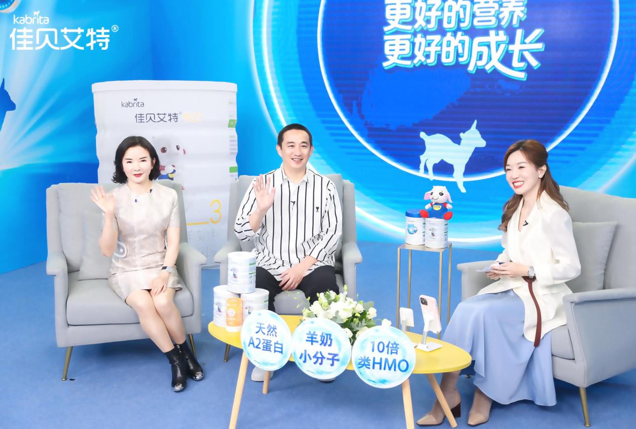 △佳貝艾特羊奶推薦大使黃磊(中)與澳優中國區副總裁、佳貝艾特總經理李軼旻(左)空降佳貝艾特直播間。