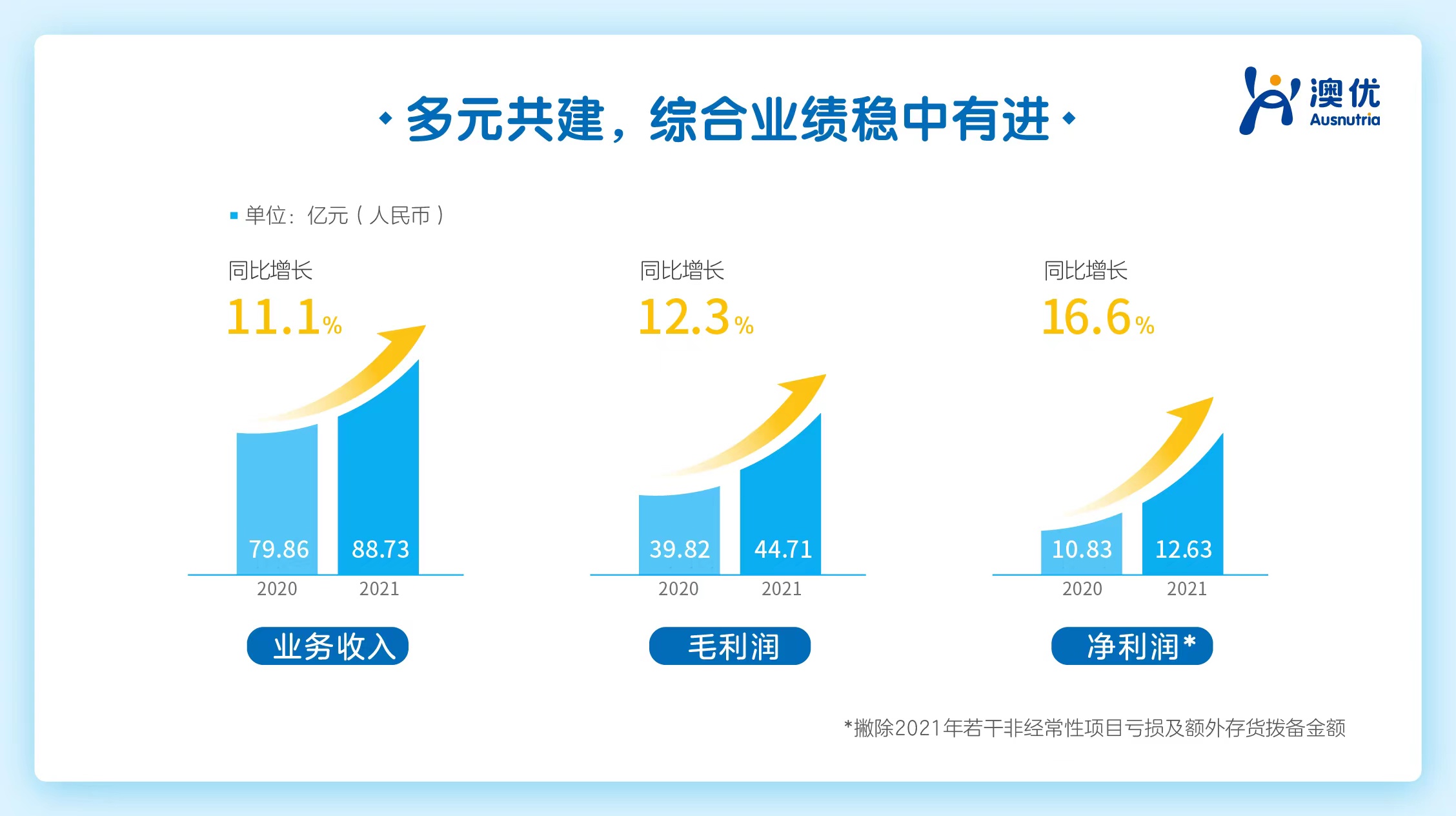 公告顯示,2021年澳優錄得收入為人民幣88.73億元,較2020年同期人民幣79.86億元同比增長11.1%;毛利為人民幣44.71億元,較2020年同比增長12.3%;撇除2021年若干非經常性項目虧損及額外存貨撥備金額,經調整錄得歸屬于公司權益持有人應占利潤為人民幣12.63億元,較2020年同期人民幣10.83億元同比增長16.6%。截至2021年12月31日,公司凈現金結余為人民幣12.14億元,繼續維持穩健的現金轉換及流動性水平。