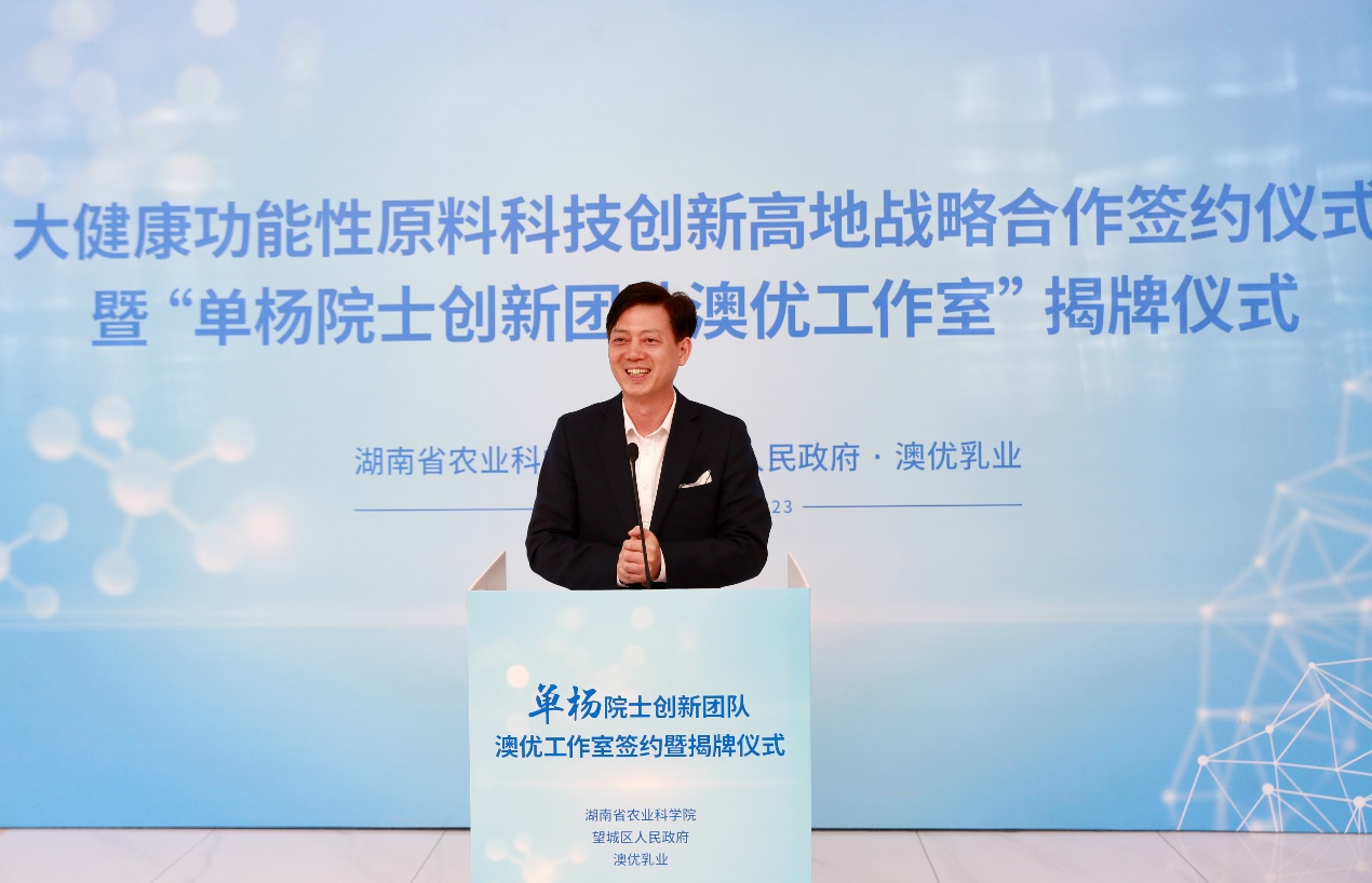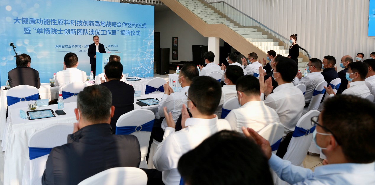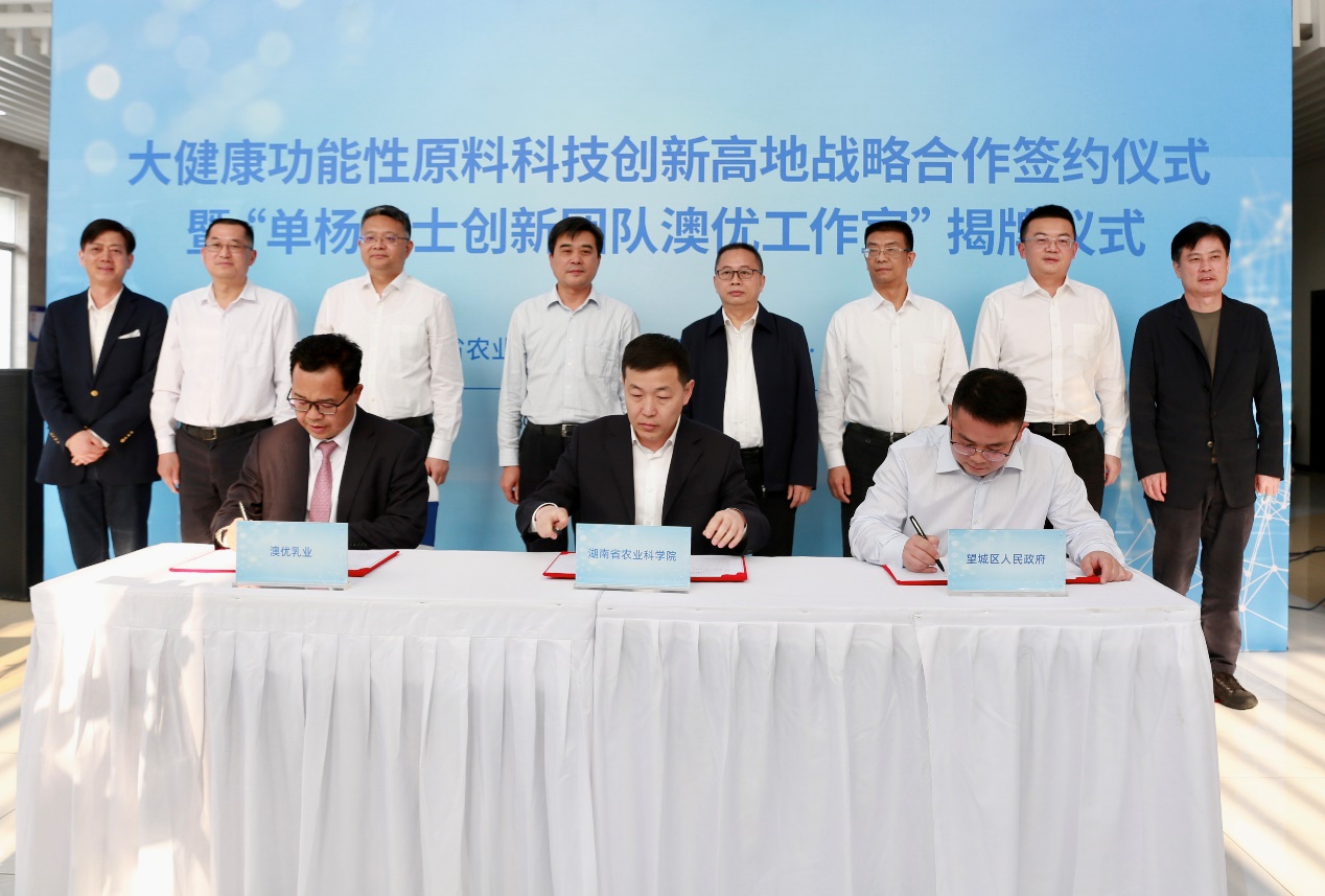 為全面落實(shí)湖南“三高四新”戰(zhàn)略定位和使命任務(wù),大力實(shí)施強(qiáng)省會(huì)戰(zhàn)略,打造大健康功能性原料創(chuàng)新高地,深化政產(chǎn)學(xué)研合作,4月23日,大健康功能性原料科技創(chuàng)新高地戰(zhàn)略合作簽約儀式暨“單楊院士創(chuàng)新團(tuán)隊(duì)澳優(yōu)工作室”揭牌儀式在澳優(yōu)長(zhǎng)沙工廠舉行。