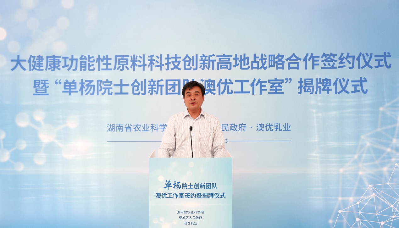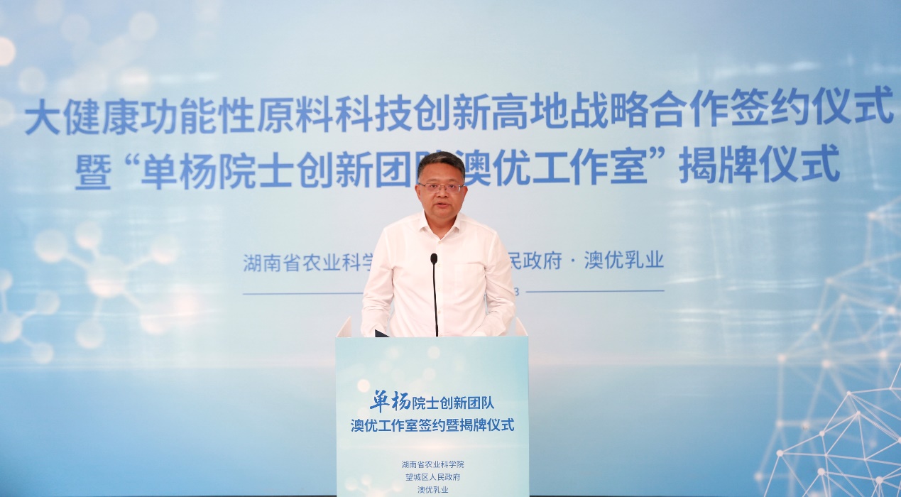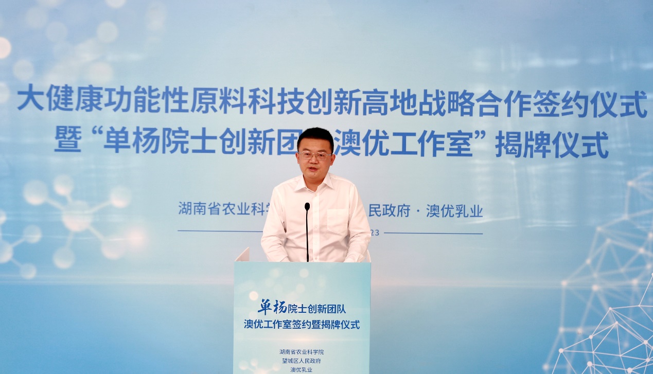 市農(nóng)業(yè)農(nóng)村局局長(zhǎng)戴建文、望城區(qū)人民政府副區(qū)長(zhǎng)周輝軍、副區(qū)長(zhǎng)黃雪峰、澳優(yōu)中國(guó)區(qū)副總裁胡芳明、中國(guó)區(qū)副總裁劉學(xué)聰、澳優(yōu)首席營(yíng)養(yǎng)科學(xué)家汪家琦等嘉賓出席本次活動(dòng)。湖南省農(nóng)產(chǎn)品加工研究所、望城區(qū)委組織部、區(qū)農(nóng)業(yè)農(nóng)村局、區(qū)科技局、區(qū)工信局、區(qū)科協(xié)等單位有關(guān)負(fù)責(zé)人參加活動(dòng)。
