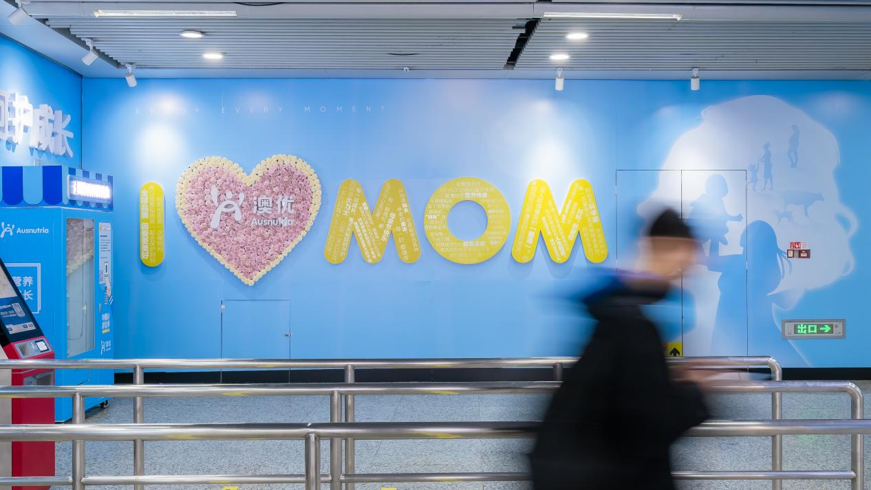 在長沙地鐵五一廣場站,一抹溫暖的藍色包裹著3A通道口的澳優品牌站廳,溫馨又走心的巨型表白墻“I ? MOM”吸引著來往行人拍照打卡,數枝康乃馨組合而成的愛心更增添了濃厚的表白氛圍。