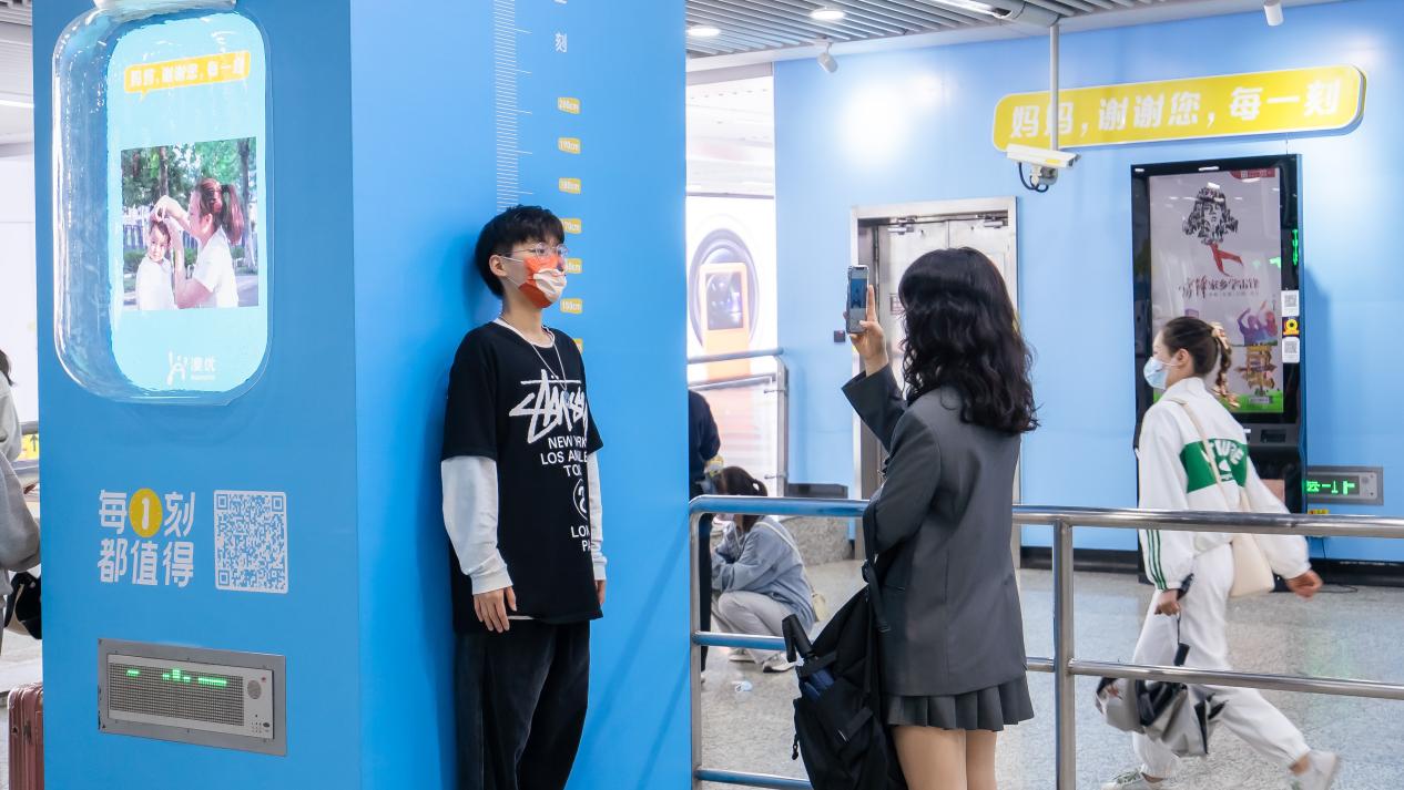 兩個透明可愛的奶瓶中循環播放著一張張孩子和媽媽的合照,每一張照片都是一個愛的故事,記錄著和媽媽的美好時刻。奶瓶另一側的身高測量互動區也不斷吸引著行人駐足,現場量起了身高,來記錄自己的每一“刻”成長。