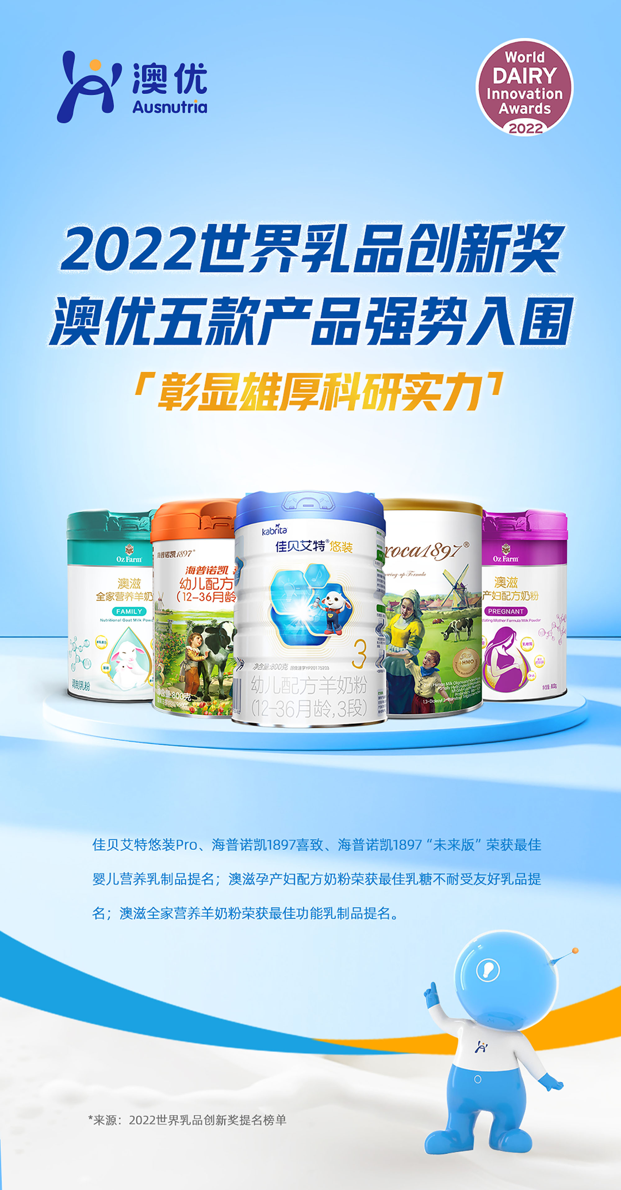 在“成為全球最受信賴的配方奶粉和營養健康公司”的企業愿景指引下,澳優通過增品種、提品質、創品牌,持續滿足全人群的多元化需求,為不同類型的消費者提供滿足他們個性化需求的健康食品與生活解決方案。獲得本次最佳嬰兒營養乳制品提名的是佳貝艾特悠裝Pro、海普諾凱1897喜致、海普諾凱1897“未來版”。另外,澳滋全家營養羊奶粉和孕產婦配方奶粉分別提名最佳功能乳制品及最佳乳糖不耐受友好乳品。