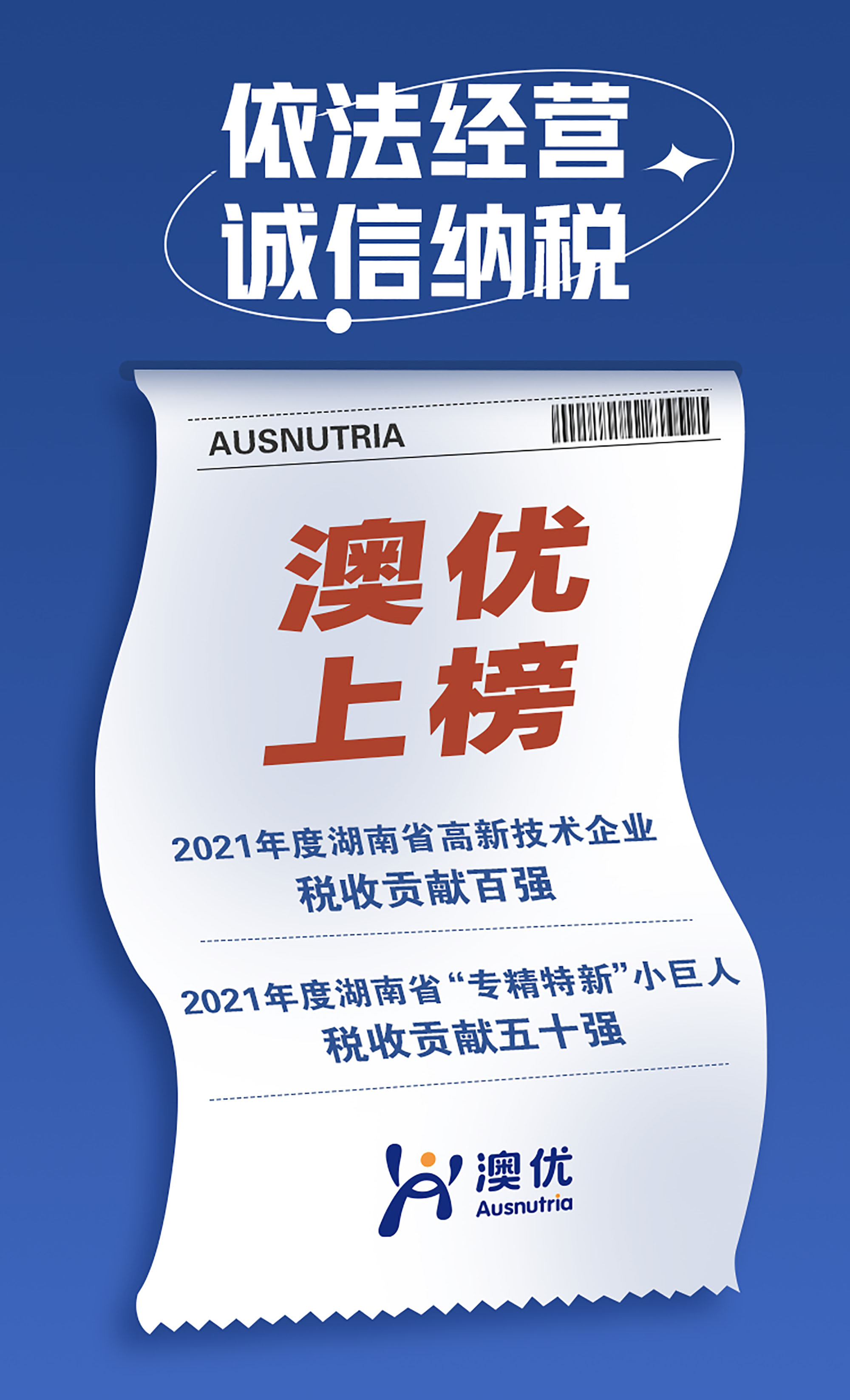 5月24日,湖南省財政廳公示了2021年度“湖南省企業稅收貢獻百強”等四張榜單。其中,澳優上榜“2021年度湖南省高新技術企業稅收貢獻百強”和“2021年度湖南省‘專精特新’小巨人稅收貢獻五十強”雙榜單。