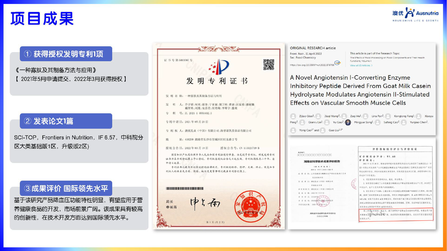 會上,潘麗娜以《山羊乳酪蛋白肽原料開發及功能驗證》為題,介紹了澳優科研團隊以山羊乳酪蛋白為原料,進行的關于羊乳降壓肽控制血壓效果的研究。研究挖掘出一個序列全新、高活性的降壓肽FPQYLQYPY,通過開展系統的體外-體內降血壓活性評價研究,結果表明該羊乳降壓肽對自發性高血壓大鼠的血壓具有很好的降壓效果。目前,該項目已申請并獲得1項發明專利授權,發表SCI論文1篇,完成科技成果評價,結論為“國際領先水平”,為澳優未來對功能性羊奶粉產品的研發進一步奠定了基礎。