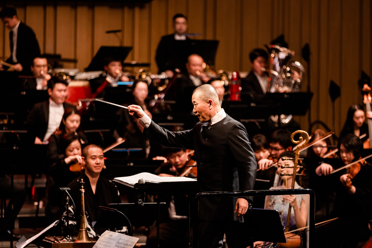 當晚八點,長沙音樂廳雅音繞梁,掌聲如潮。在譚盾的傾情執棒下,水打擊樂演奏家榮辰初、篳篥演奏家劉雯雯、奚琴演奏家祝云琦、敦煌尺八演奏家楊博文、五弦琵琶演奏家韓妍、唐笙演奏家張夢聯袂登臺,與長沙交響樂團攜手,共同為音樂愛好者們打造一場視聽盛宴。