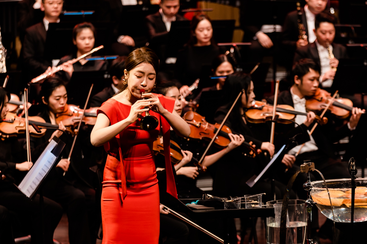 本次音樂會共演奏了《召喚英雄》《敦煌五樂神》《水樂》《波萊羅之舞》《百鳥朝鳳》五首作品。在《水樂》的演奏過程中,水這一自然之物被作為樂器發出聲響,與人類管弦樂和諧共鳴。曲中自由寬廣的引子、神秘的慢板、如歌的行板、激情的快板依次遞進,如源源活水奔涌入海,引領觀眾感悟自然的蓬勃生機。在《百鳥朝鳳》的演奏過程中,我國傳統樂器嗩吶以穿透力、感染力極強的歡快旋律和逼真的模擬鳥鳴聲,與管弦樂合奏,將一幅百鳥鬧春的美麗畫卷徐徐展開。演奏完畢后,現場雷鳴般的掌聲經久不息,歡呼聲此起彼伏。