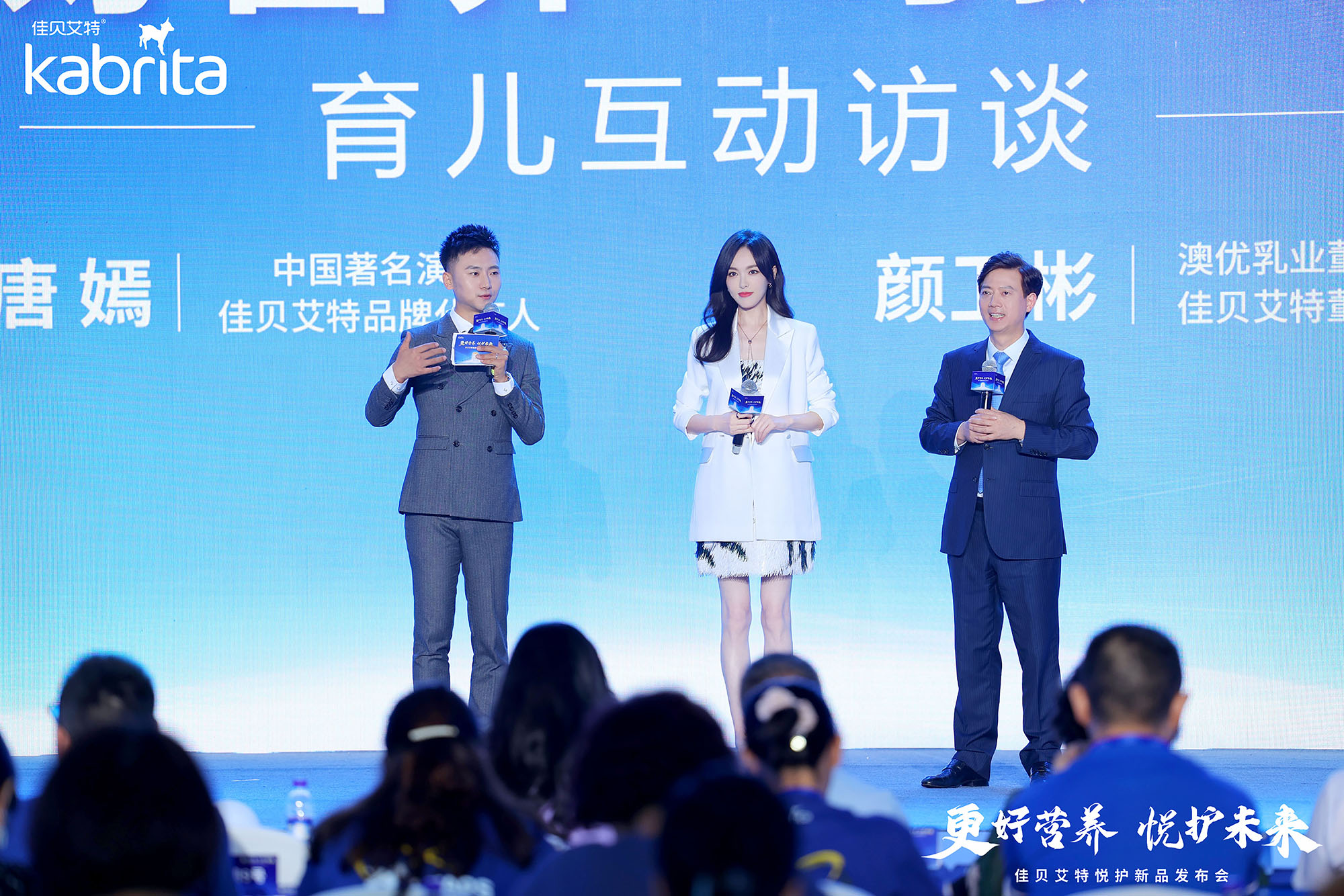 △澳優董事長顏衛彬和佳貝艾特品牌代言人唐嫣進行“更好營養 呵護成長”育兒訪談互動。