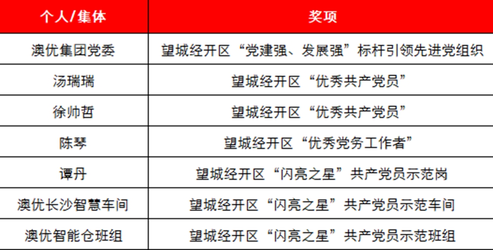 為表彰先進、弘揚正氣,激勵各黨支部、廣大黨員和黨務工作者奮勇爭先、建功立業,大會特設表彰環節,分別授予李超波等8名同志“優秀共產黨員”稱號,授予文佳等3名同志“優秀黨務工作者”稱號,授予中共澳優食品與營養研究院支部委員會“先進基層黨組織”稱號,授予愛益森湘西優康業務攻堅突擊隊“最佳業務攻堅突擊隊”稱號。
