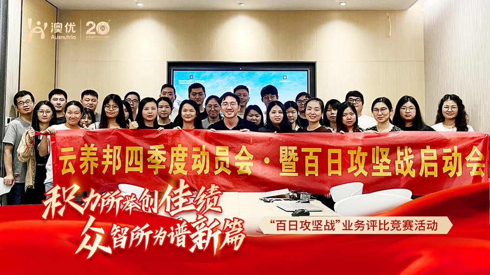 9月27日-10月7日,在澳優總部的統一部署下,澳優旗下奶粉業務單元佳貝艾特、海普生物,營養品業務單元愛益森、云養邦分別召開“積力所舉創佳績,眾智所為譜新篇”暨“百日攻堅戰”業務評比競賽活動啟動大會。會上,各業務單元詳細布達活動總方案,并根據自身業務特點,有針對性地細化方案、分解任務目標,確保本次活動取得扎實成效,進一步提升消費者體驗,夯實企業發展根基。