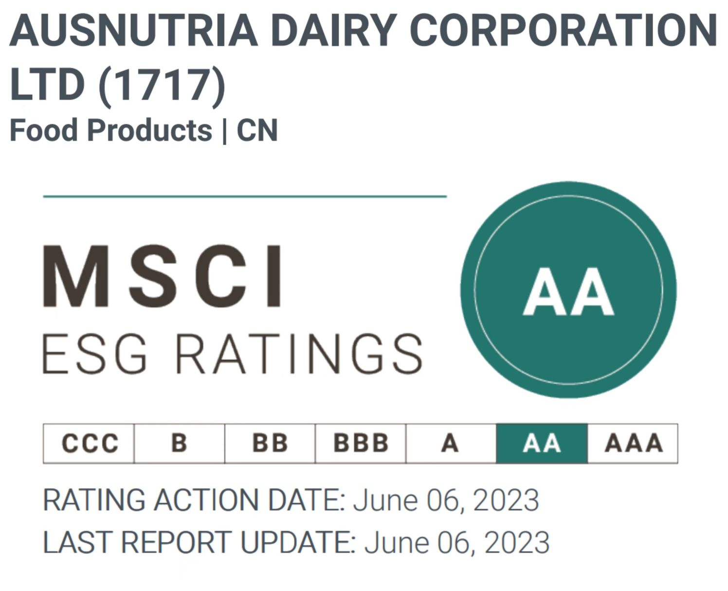 自2016年起,澳優已連續八年發布關于公司業務運營與可持續發展緊密結合的報告。2023年,得益于在ESG領域的深入實踐,澳優的MSCI ESG評級由A級提升至AA級,成為中國食品行業第一家獲評為AA級的企業,可持續發展表現獲得行業和社會的廣泛認可。